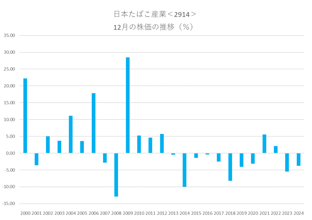 JT株が12月にどのような値動きをする傾向があるのか分析します。2000年から2024年までの25年間のデータを集計した結果、興味深い傾向が見えてきました。