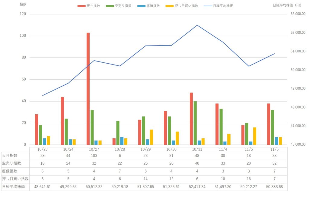 日経平均株価 は、11/5に一時4万9073円まで下落しつつも、終値では5万212円と引き続き5万円の高値圏で推移しました。