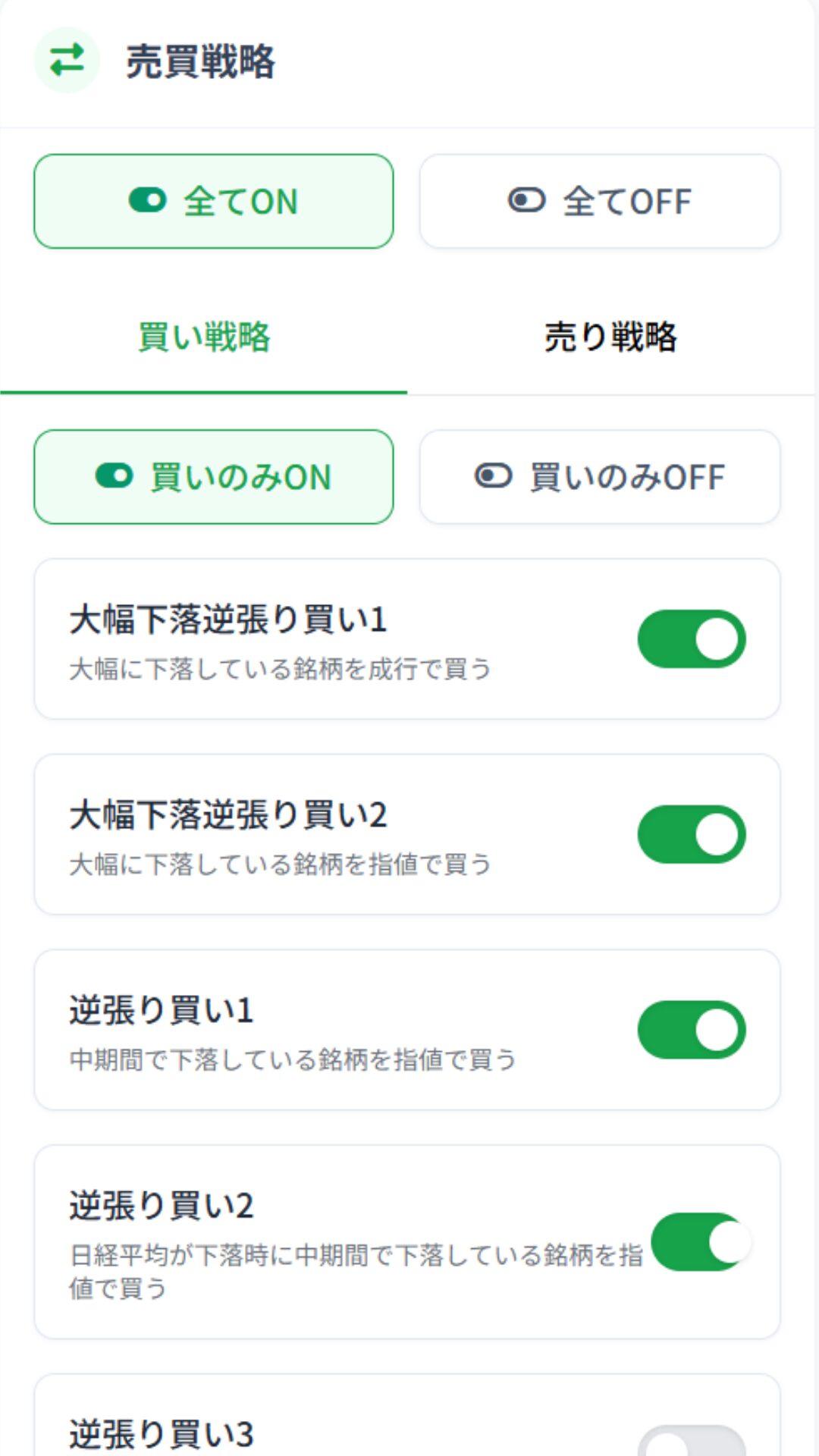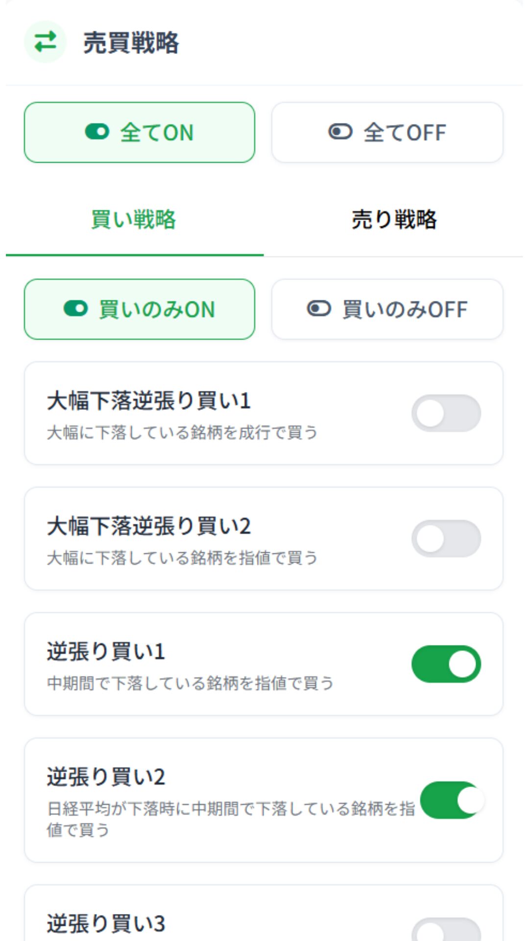 - 戦略ON/OFF: 戦略ごとにON/OFF可