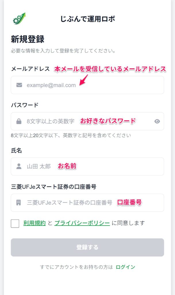 『じぶんで運用ロボ』新規アカウント登録ページ