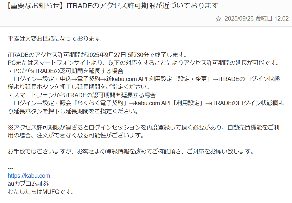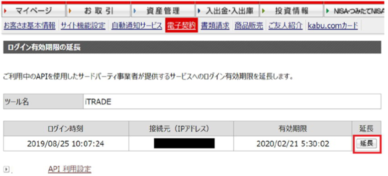 じぶんで運用ロボの会員サイト内の API 延長設定もしくは、三菱UFJ e スマート証券サイトの以前 API を設定した、電子契約からの API ページからじぶんで iTRADE の項目のログイン状態の延長ボタンを押します。
