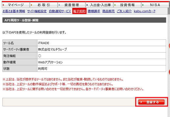「じぶんで運用ロボ」の下記画面から、三菱UFJ eスマート証券API(ツール名:iTRADE)との連携設定を行います