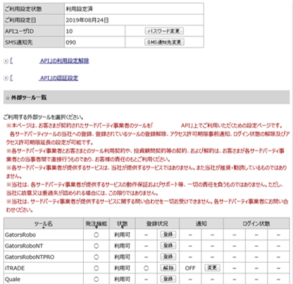 - API の切り替え期限日が過ぎた後でも、API の切り替え設定を行う事で「じぶんで運用ロボ」での売買が可能です