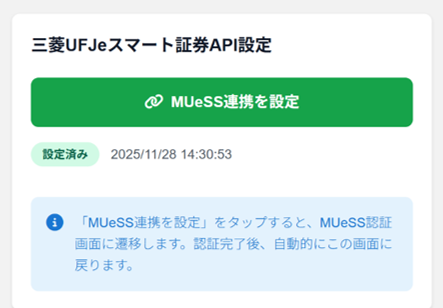 「じぶんで運用ロボ」の画面に戻り、「三菱UFJ eスマート証券API」の連携設定を行います